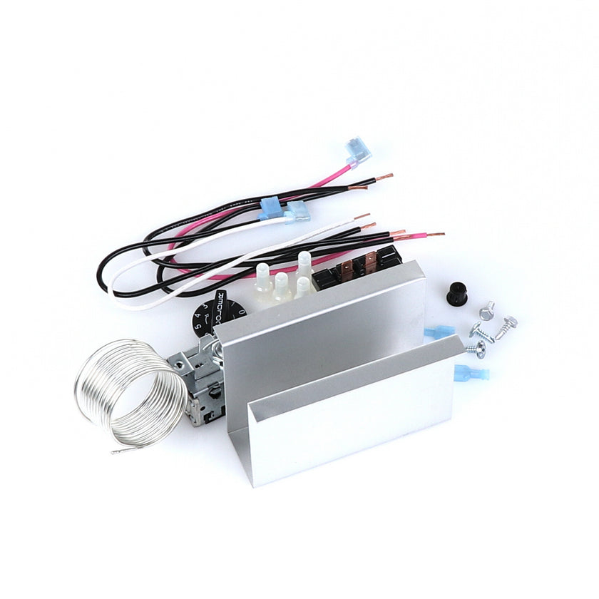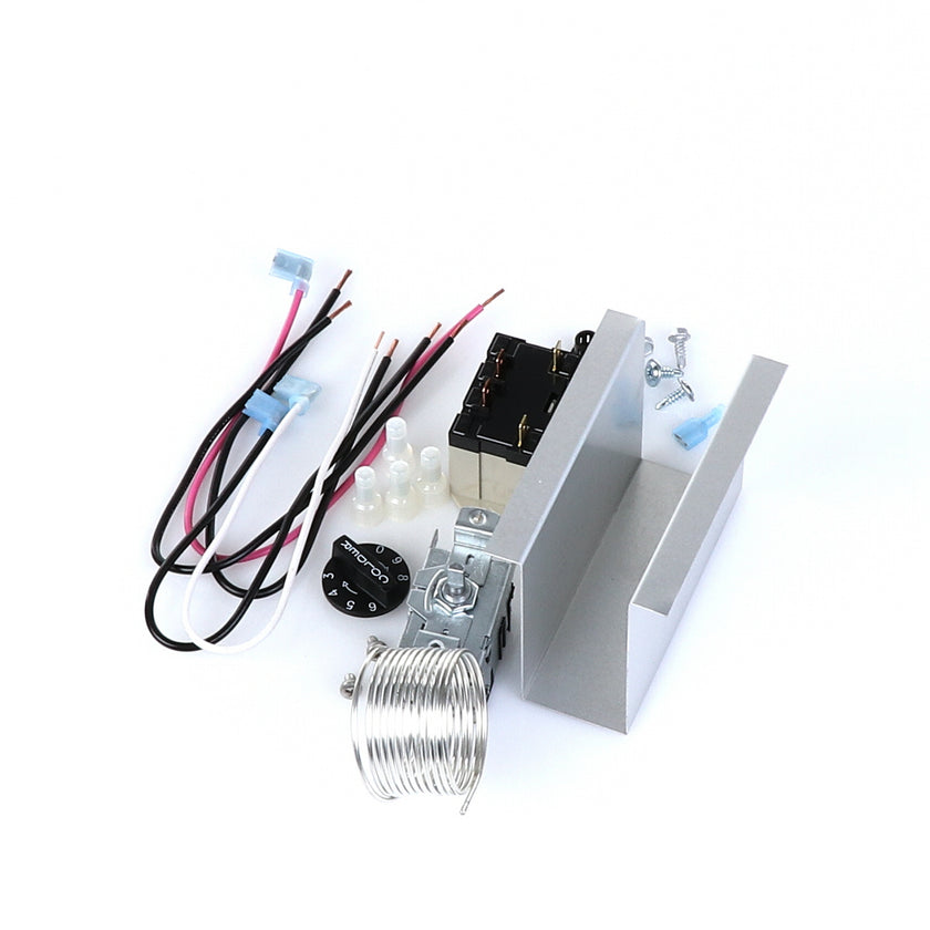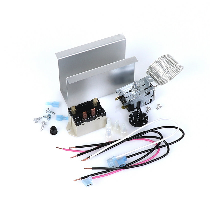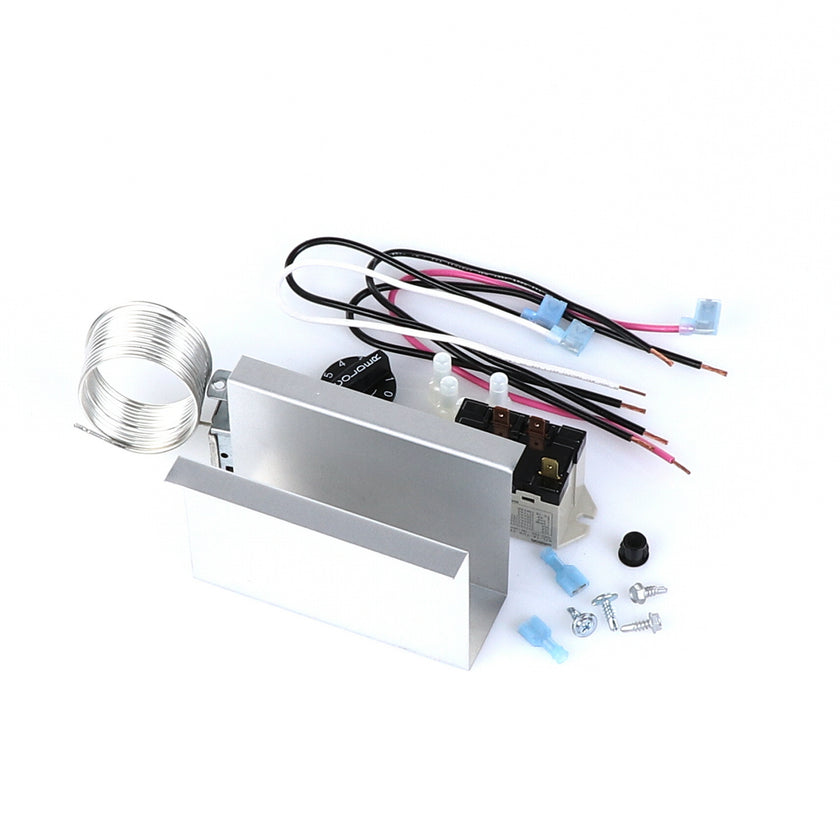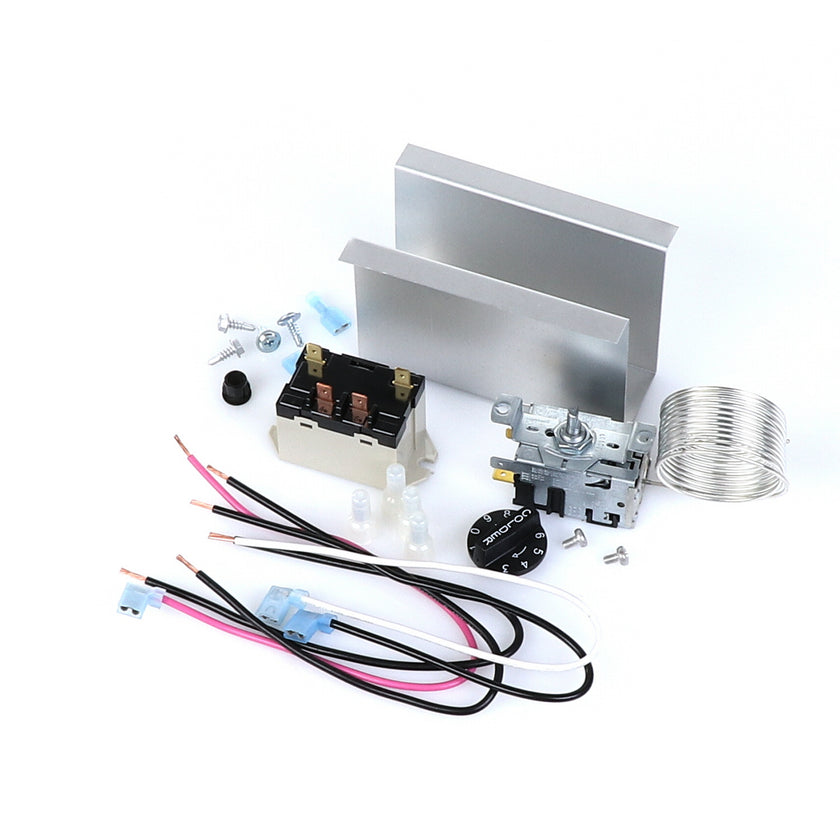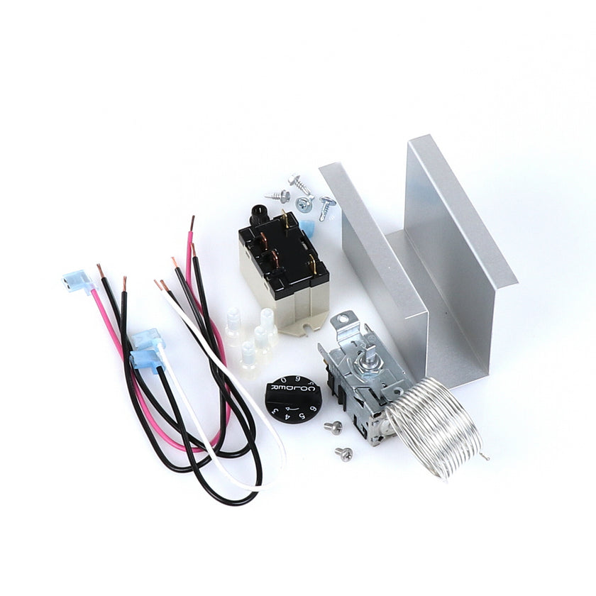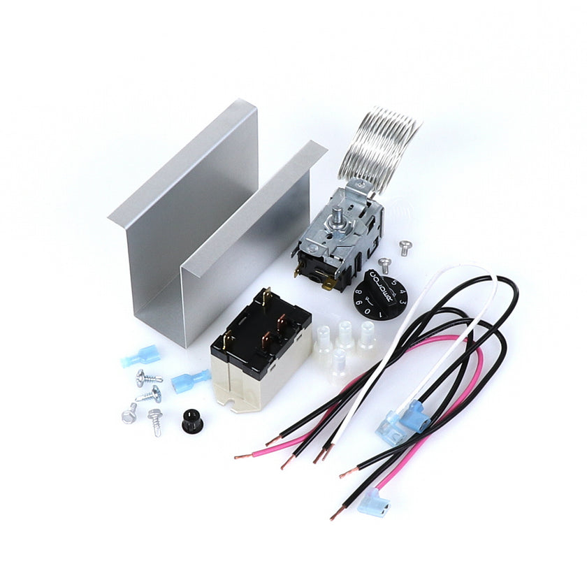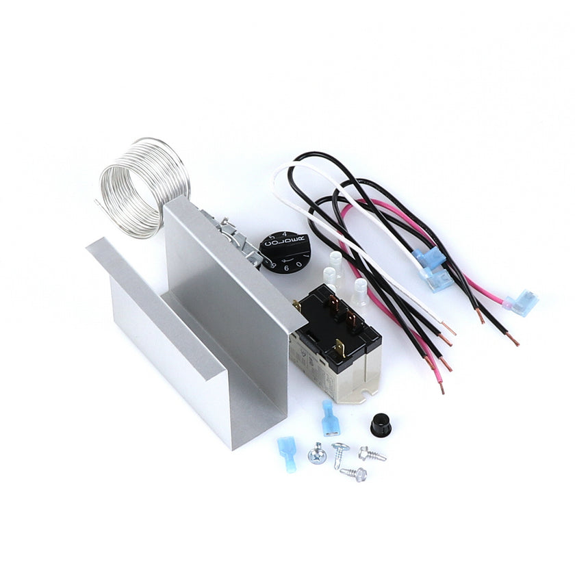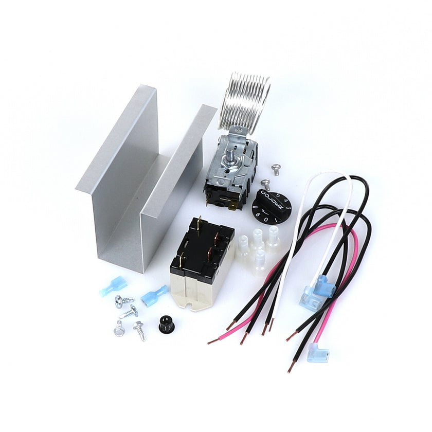 TEMP CONTROL KIT 077B6806 INCLUDES: 1)800366 TEMPERATURE CONTROL, 1)800182 RELAY, 1)890353 RELAY COVER, 2) 917352 12" BLACK WIRES, 1)800706 12" PINK WIRE, 1)800705 12" WHITE WIRE, 4)830592 SCREWS, 2)830566 SCREWS, 1)811209 BUSHING, 4)802143 STA-CON CONNECTORS, & INSTRUCTION SHEET