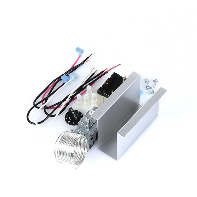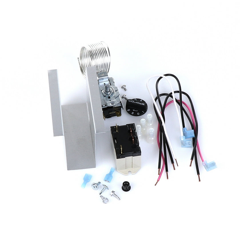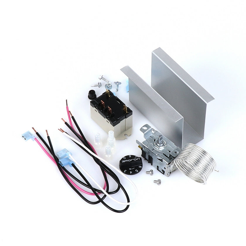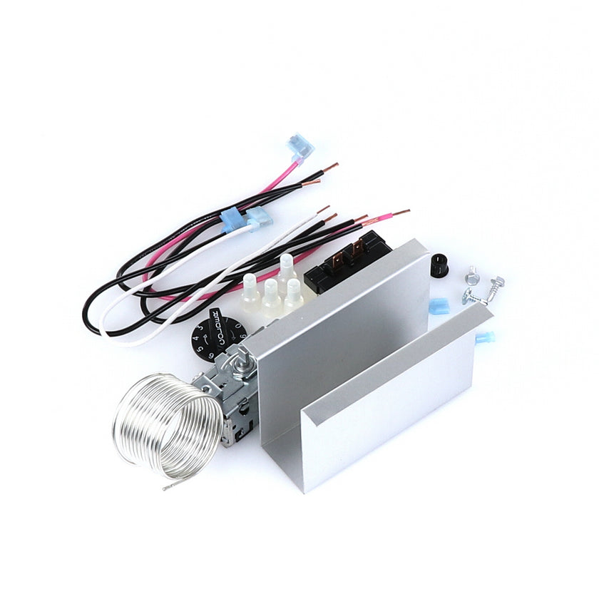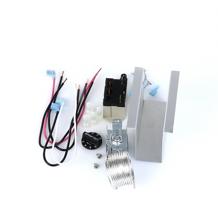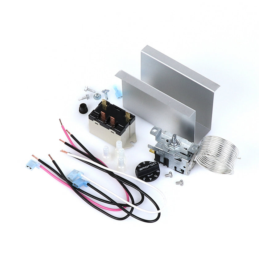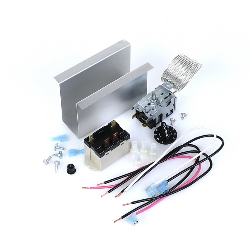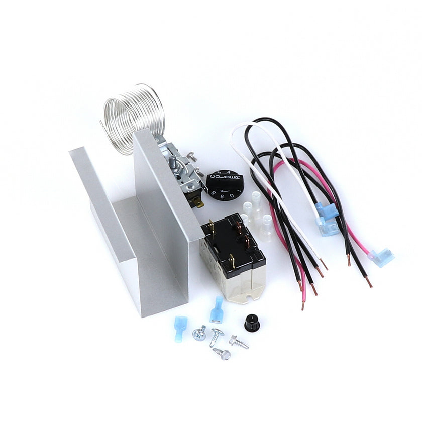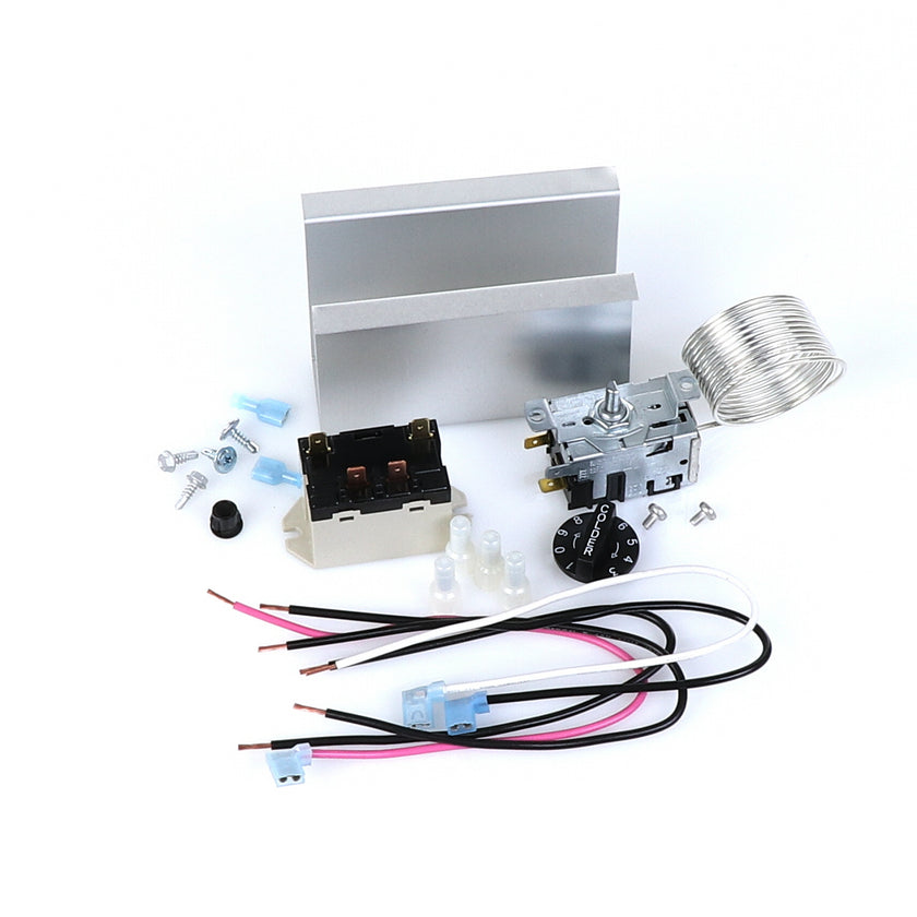 TEMP CONTROL KIT 077B6806 INCLUDES: 1)800366 TEMPERATURE CONTROL, 1)800182 RELAY, 1)890353 RELAY COVER, 2) 917352 12" BLACK WIRES, 1)800706 12" PINK WIRE, 1)800705 12" WHITE WIRE, 4)830592 SCREWS, 2)830566 SCREWS, 1)811209 BUSHING, 4)802143 STA-CON CONNECTORS, & INSTRUCTION SHEET